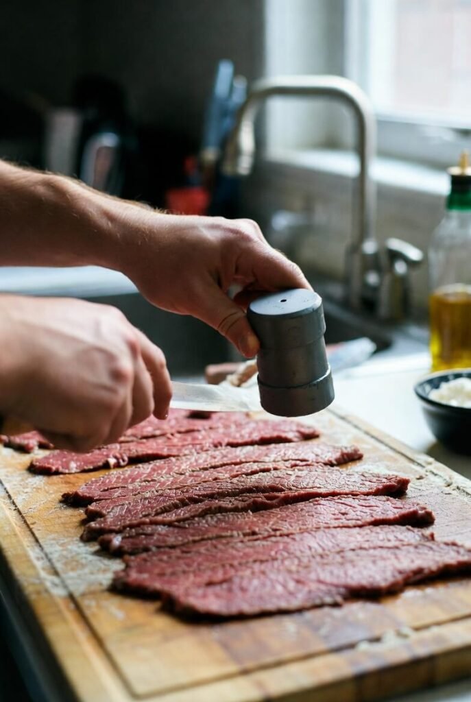 Nana used flank steak or top round. She’d pound it like it personally offended her. There was no measuring thickness. She just knew. Muscle memory. Generational rage? Who’s to say.