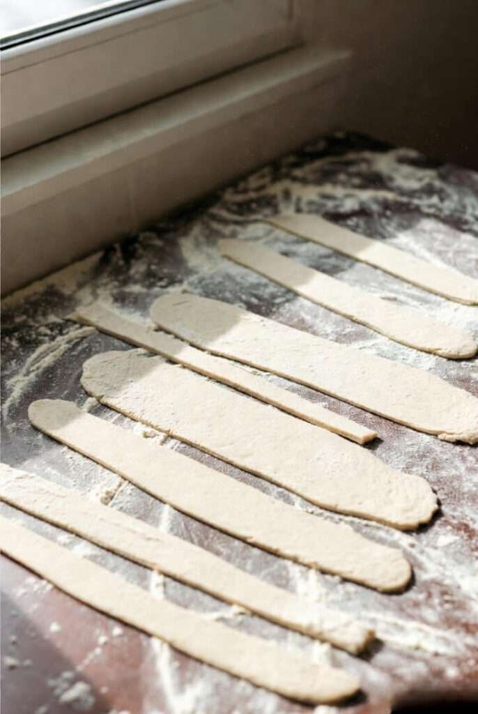 Roll the dough out. Cut it into strips. They don’t need to match. In fact, they shouldn’t.