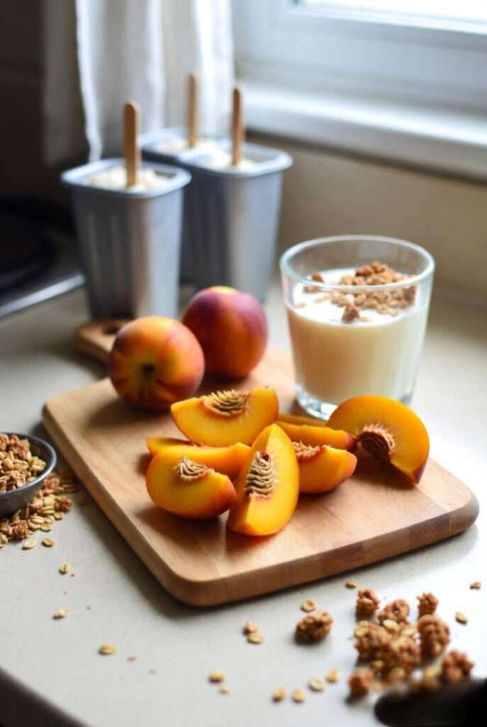 Okay so first—what are these things? Peach Crisp Parfait Pops….Think layers of peachy goodness, crunchy oat crisp crumbles, and tangy yogurt, all frozen into a popsicle that tastes like your grandma’s pie married your favorite parfait and then got chill. Literally.